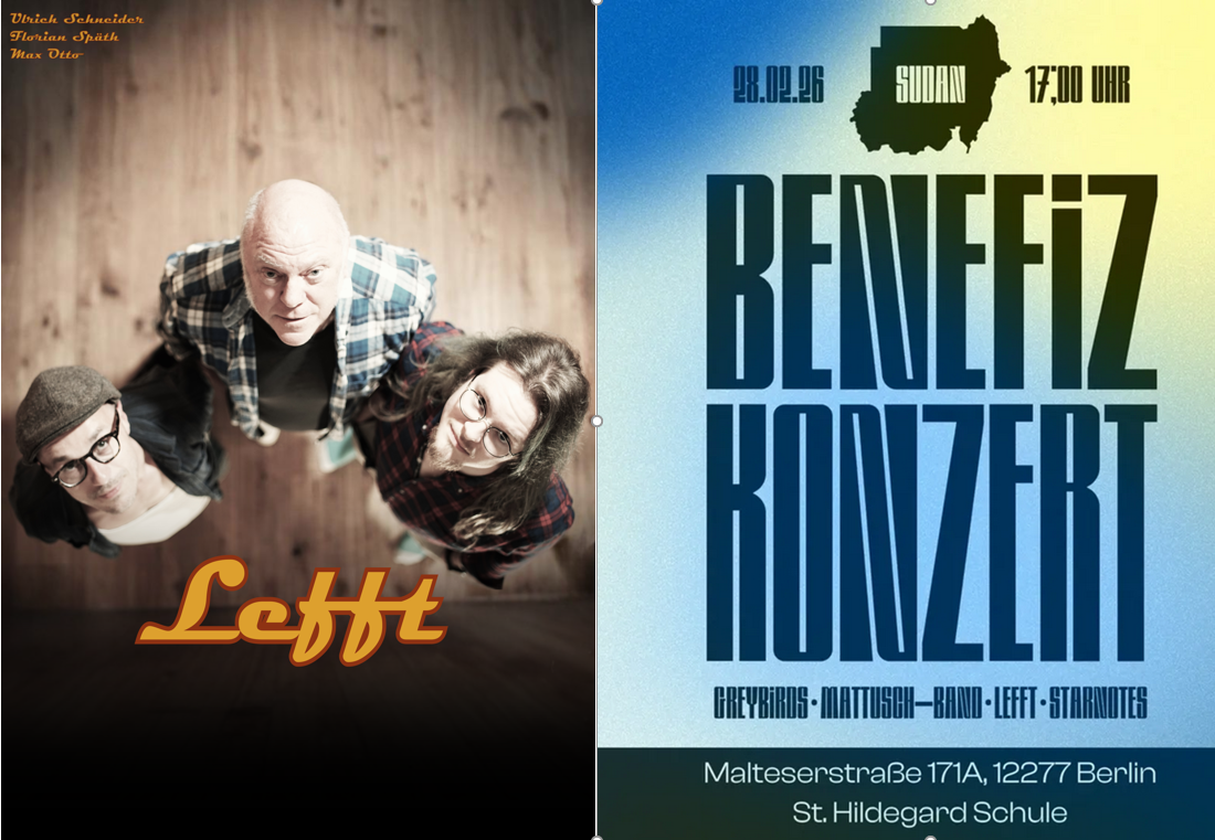 Am 28. Februar heißt es wieder „Let’s Boogie …“ Mit meiner Band Lefft auf dem Sudan-Benefiz mit uns und den Greybirds, der Matusch-Band und Starnotes beginn 17:00 Uhr in der St. Hildegard Schule Maltesertraße 171A